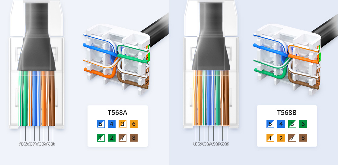 T568A和T568B的唯一区别是橙色线对和绿色线对位置互换。